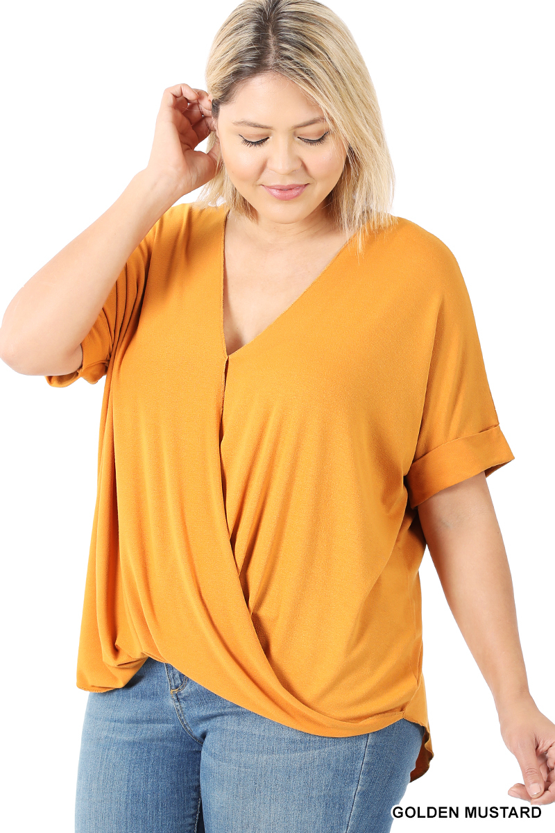 PLUS RAYON SPAN CREPE LAYERED-LOOK DRAPED FRONT TOP